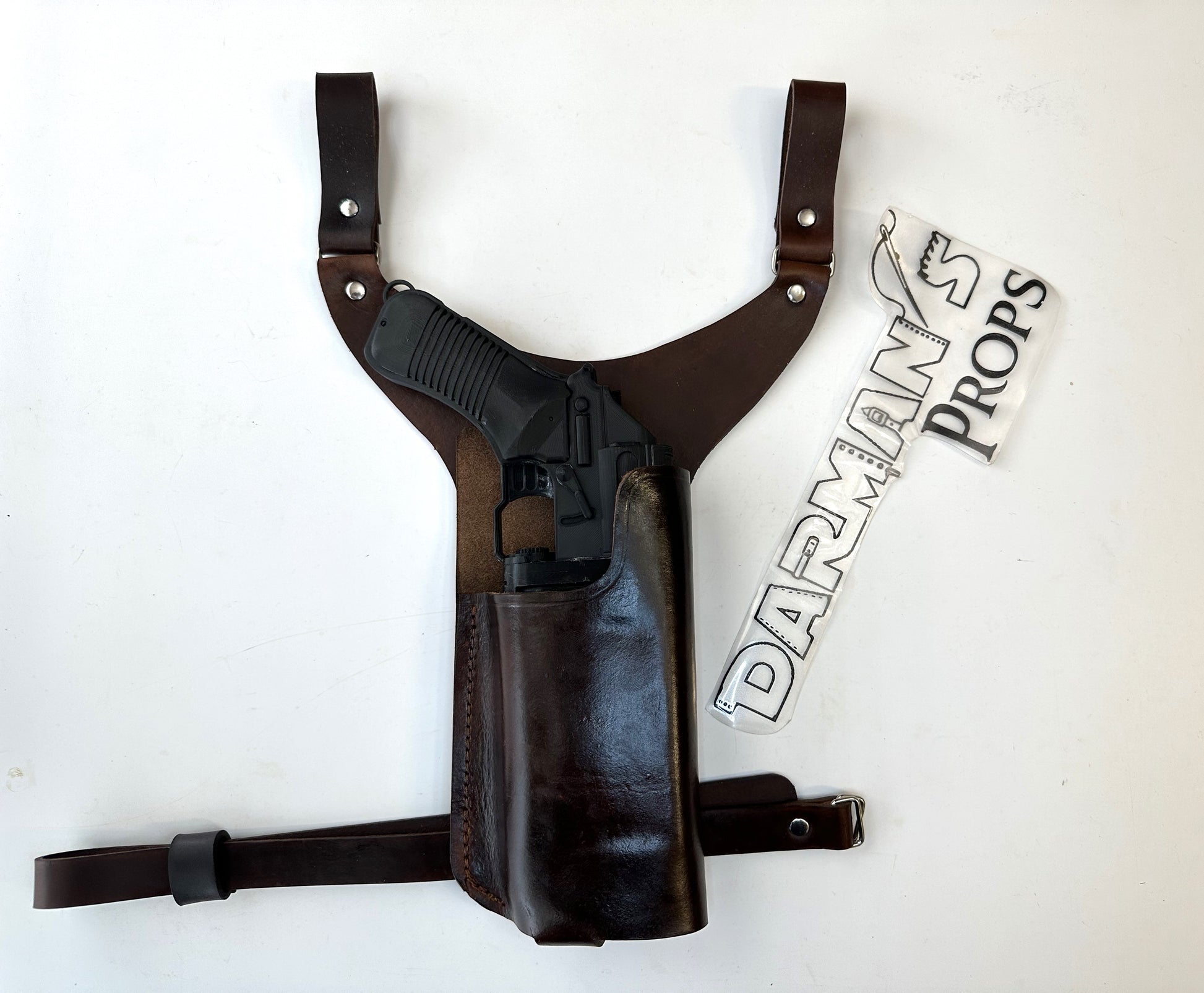 This is a Real Leather Holster for Cassian Andor's MW-20 Bryar, from the show "Andor". Made to fit an accurately scaled blaster. This holster is set up in a "Y" drop style .