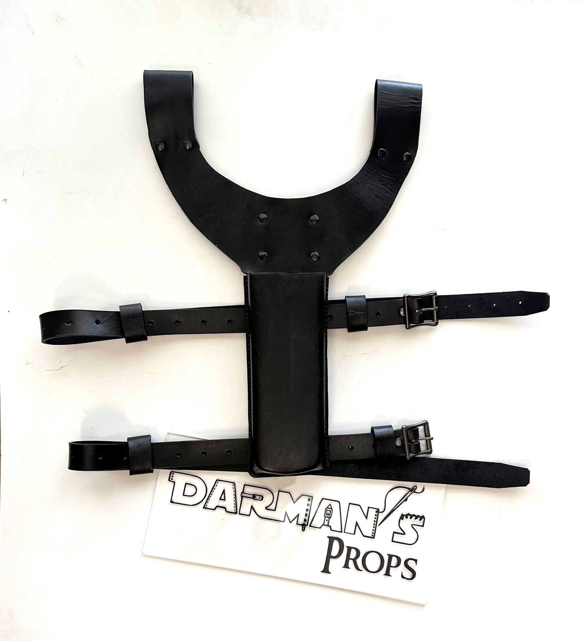 Daredevil "Y" drop pouch based on artwork provided by a previous client. "Y" drop pouch, with a double thigh strap. Pouch will have a 8" deep pocket. The pocket is divided into two sections, one for each stick. The buckles and rivets are in a Gunmetal finish.