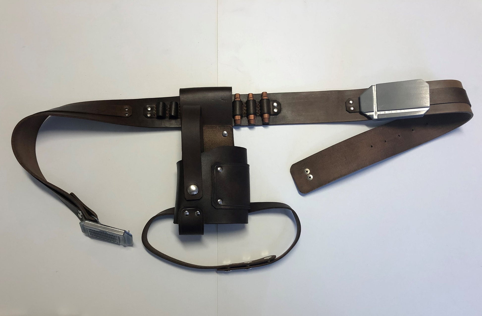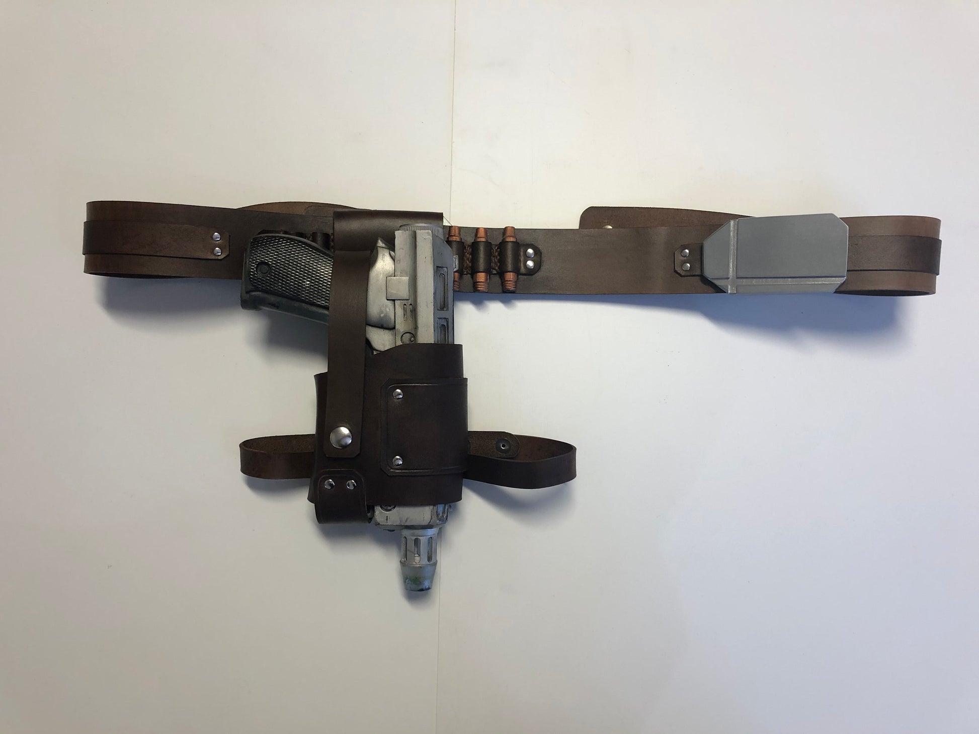 Rise of Skywalker Finn full belt rig, with a 3D printed side buckle face with a real metal buckle attached underneath, a hand made front buckle, and 3 3D printed ammo parts included. It will fit a accurately scaled Glie-44 blaster. This version is designed after the holster and belt rig seen in The Rise of Skywalker.