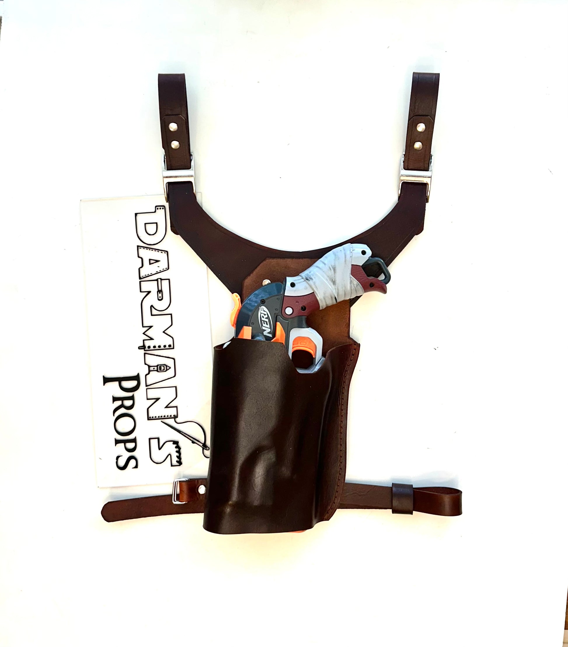 This is a real leather, Nerf Hammershot "Y" Drop Holster with Keepers, made to fit a Nerf Strike Hammershot Toy Blaster. We can make it fit your Hammershot even if you have custom parts attached, as you can see from in the photos. Send us a picture of how yours is set up and we can make any neccessary adjusts as needed. If no pictures are sent, we will assume your blaster is how it came from Nerf without any add ons and make the holster accordingly.