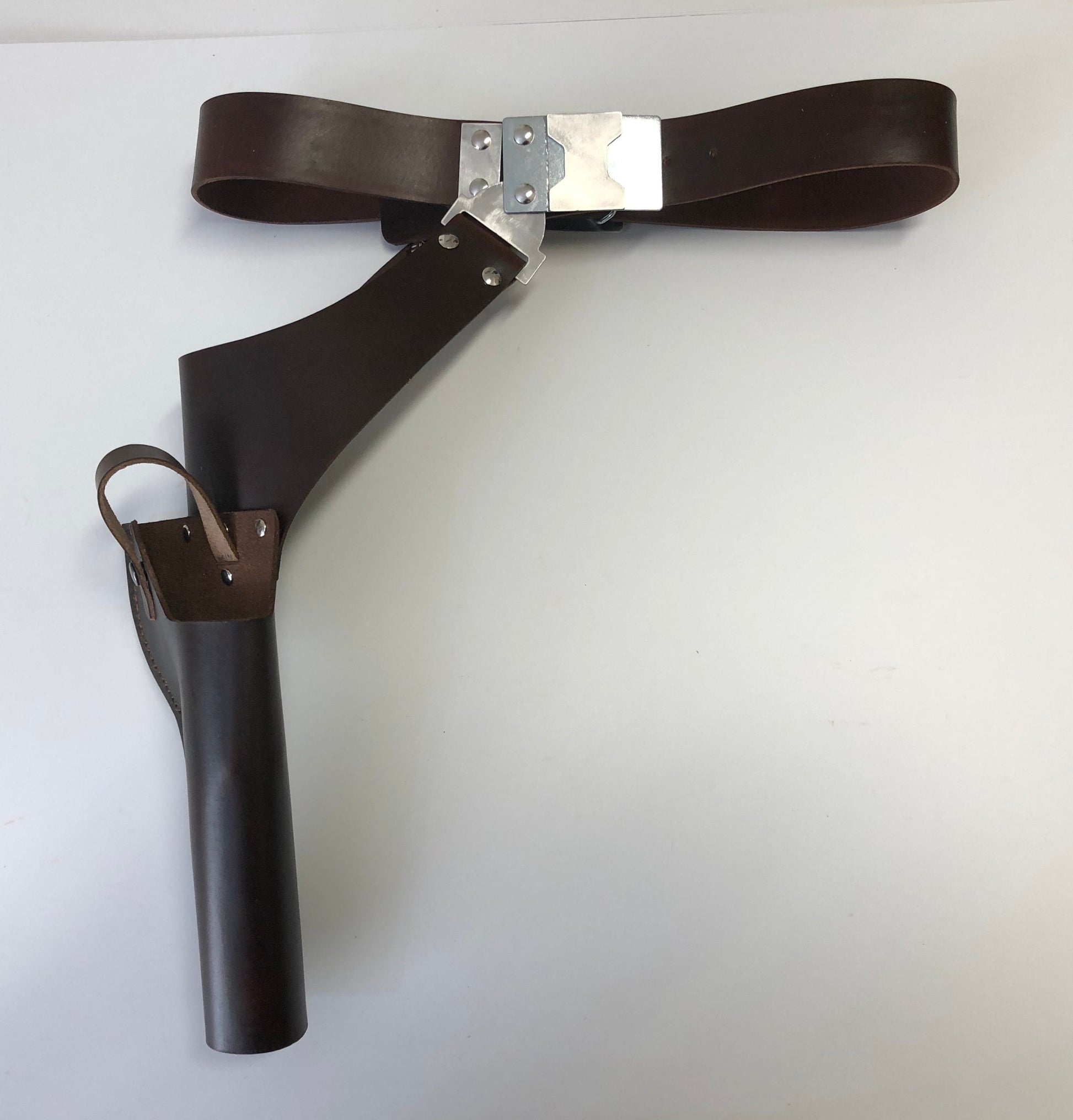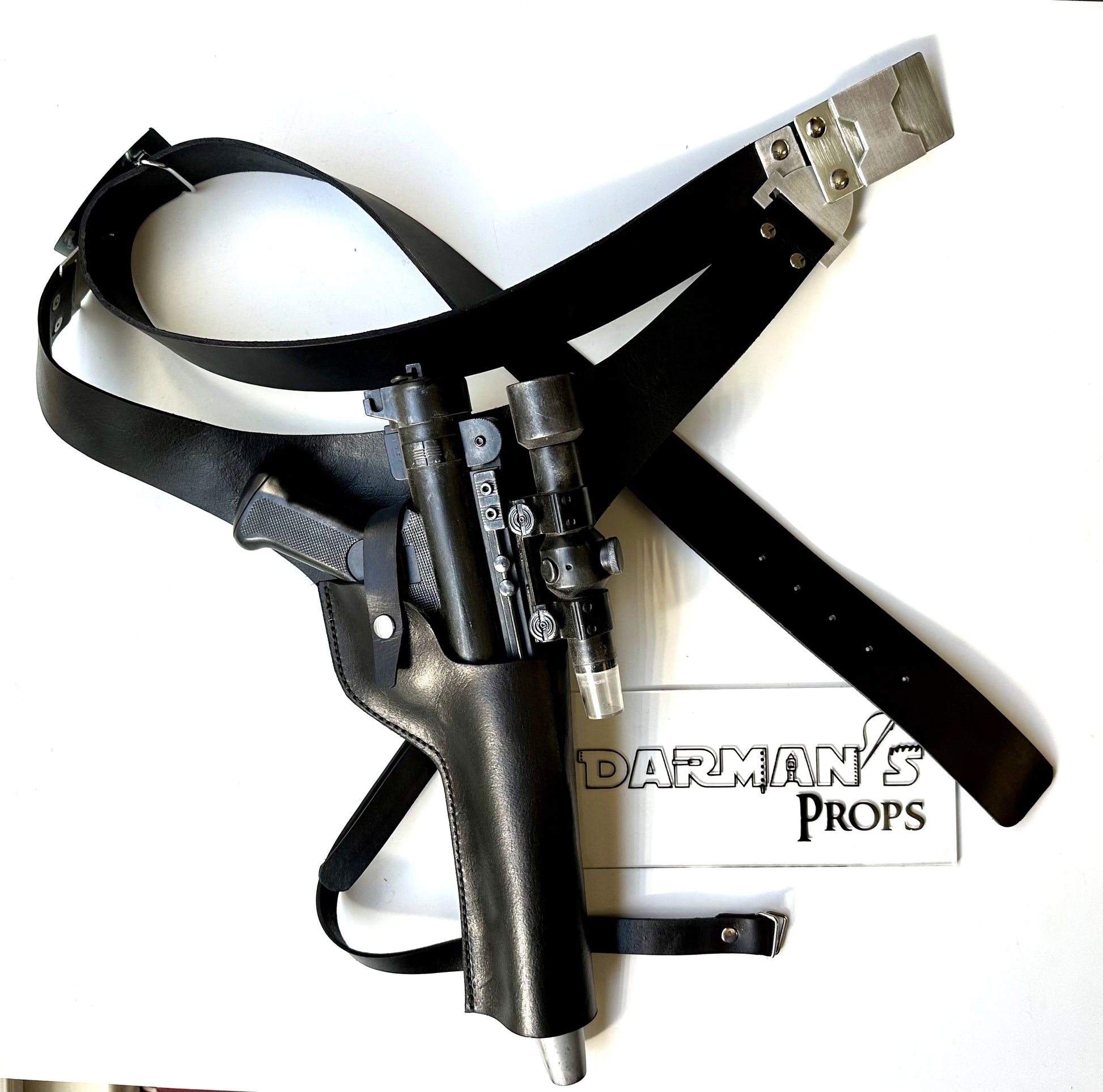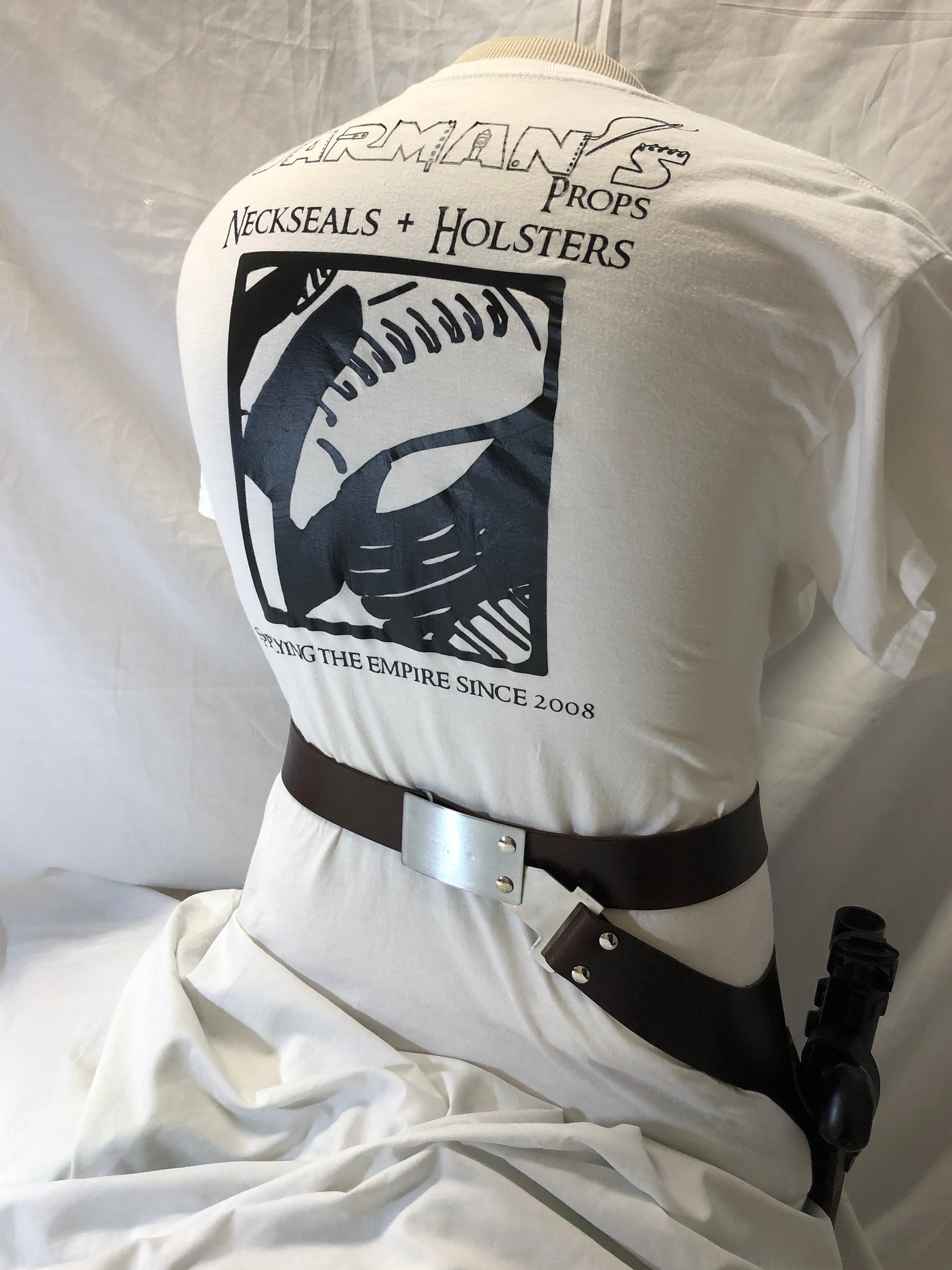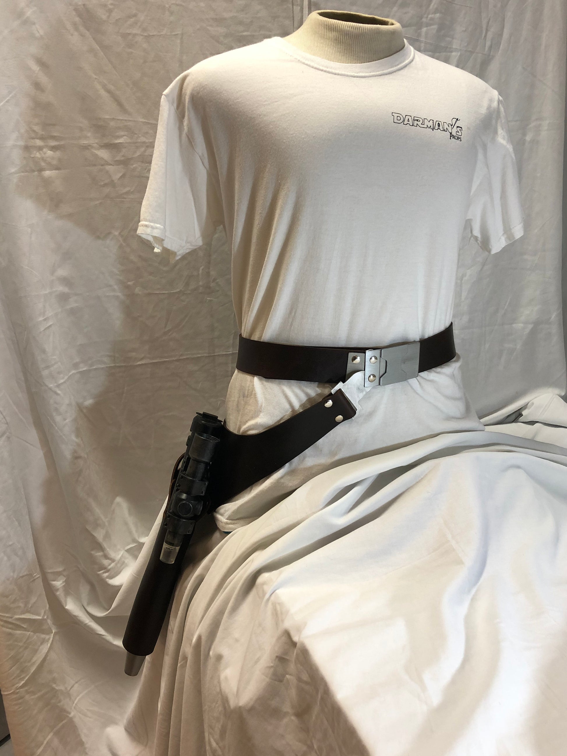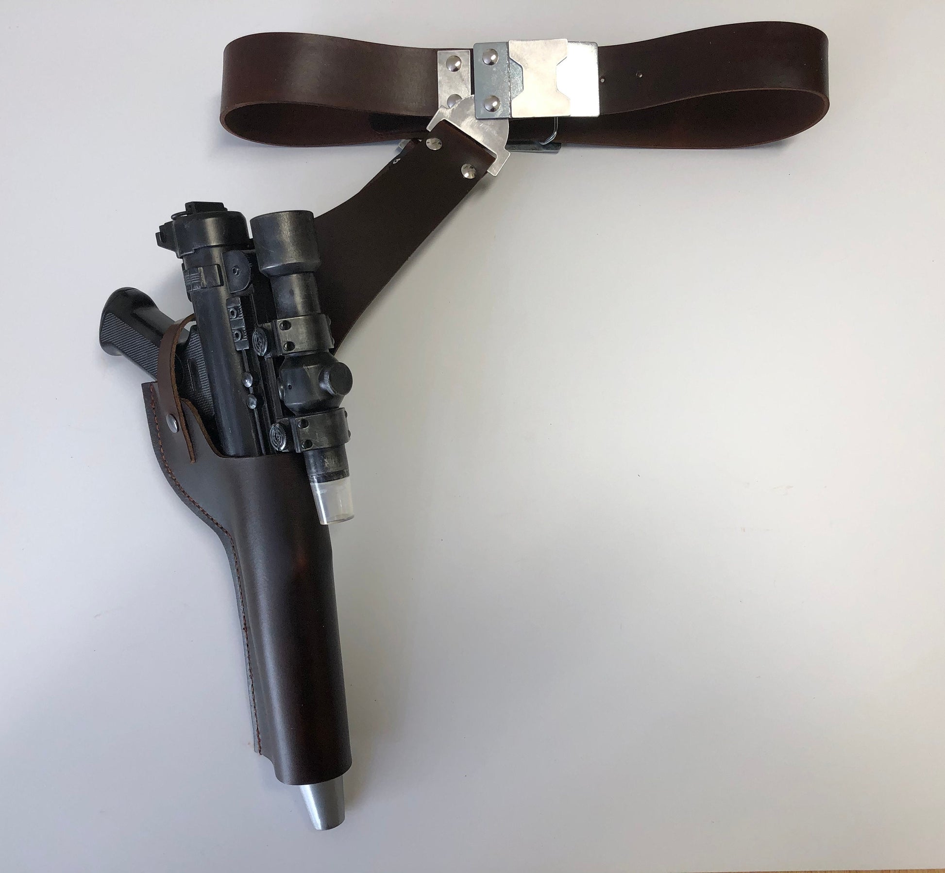 Nien Nunb Holster Rig from Battlefront 2 Game. The buckles and Hangers are made of Metal. This is a real leather, Brown DH-17 Holster, 1 3/4" wide belt, metal front and rear buckles, and a set of metal hangers.