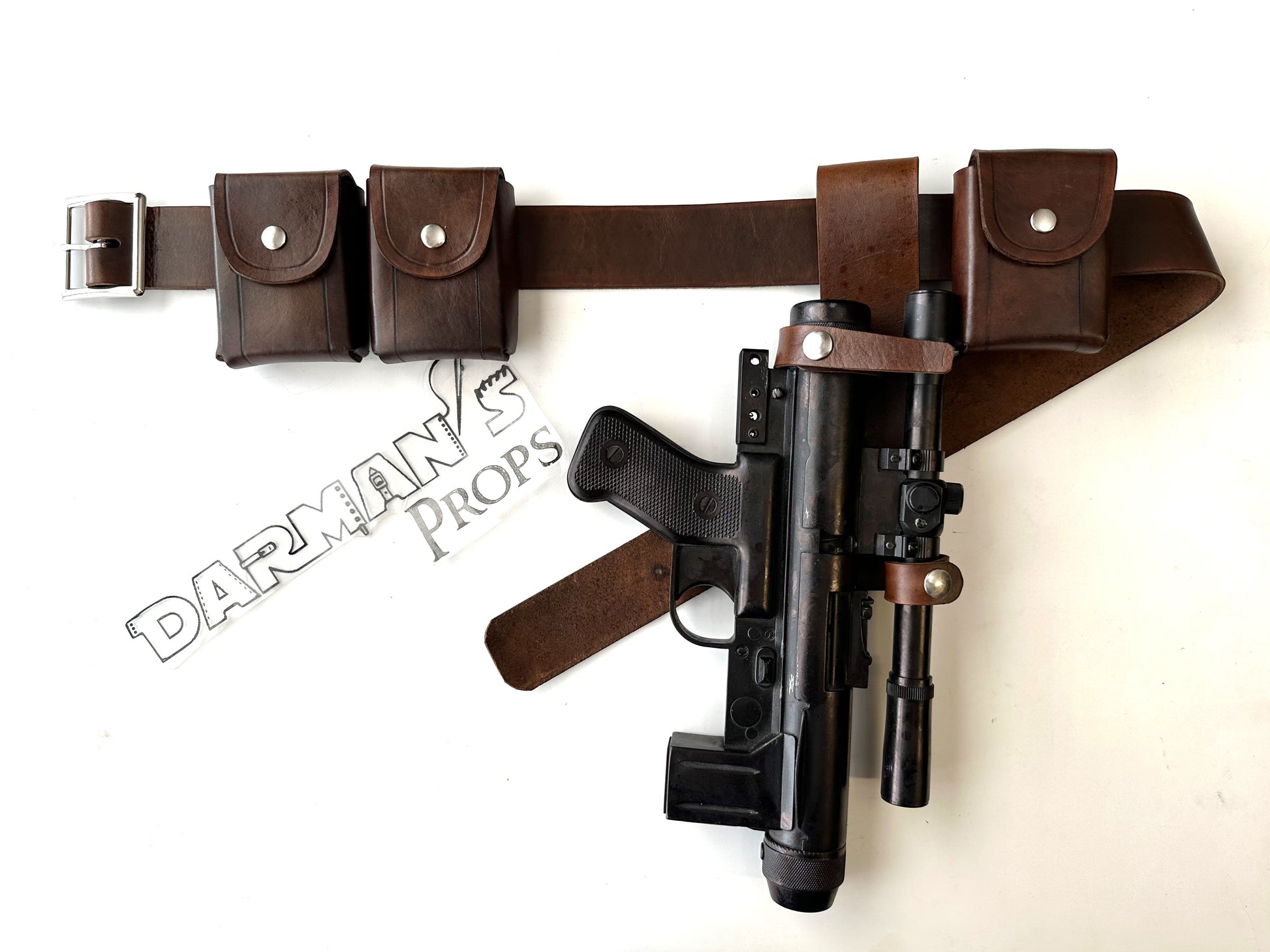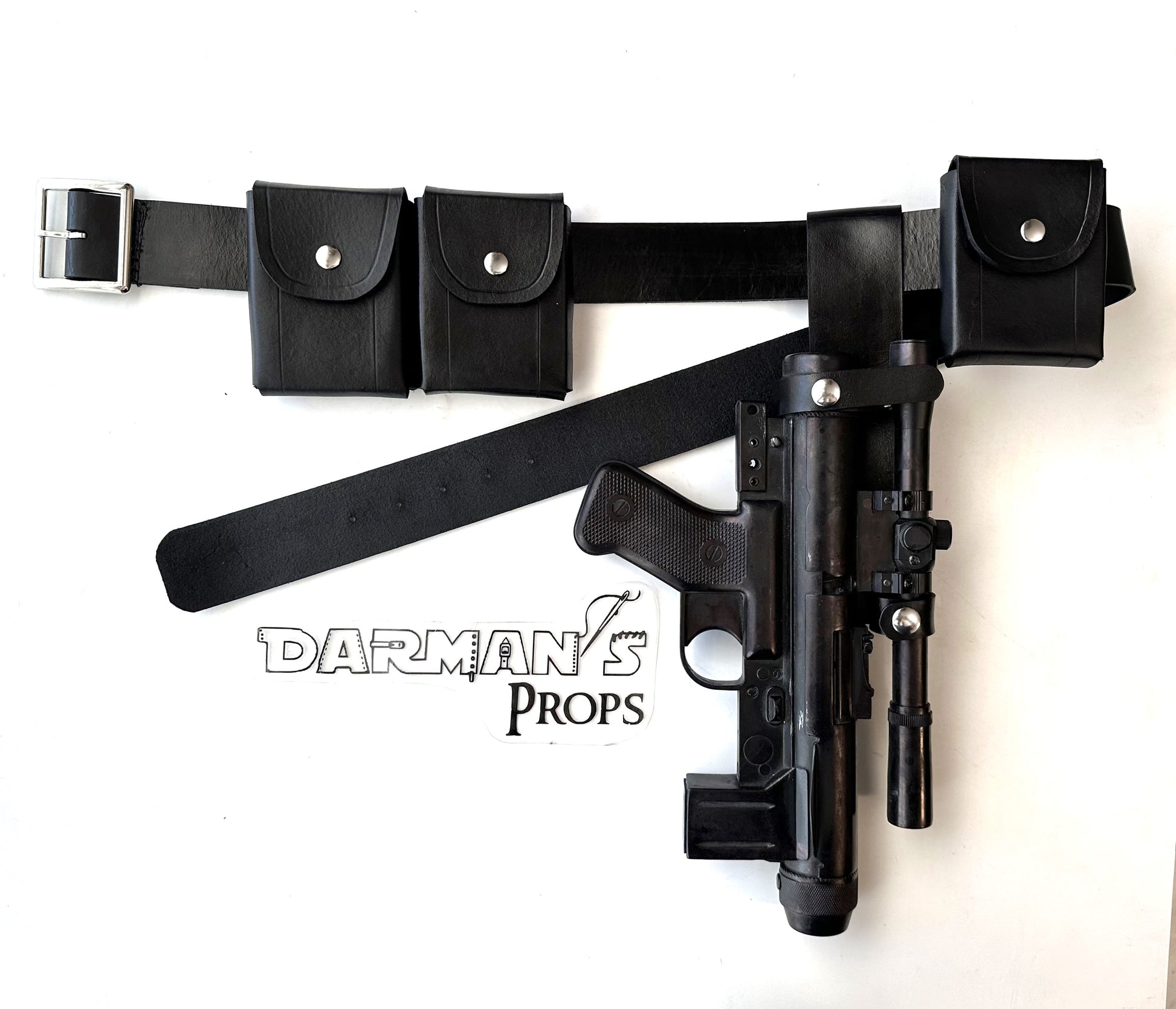 This is a real leather Deathtrooper style Holster, Belt, and 3 Pouches. They will be a fantastic addition to your Sabe costume. It is based on the comic book character. If you want a different version, message us with a picture and details about what you want.