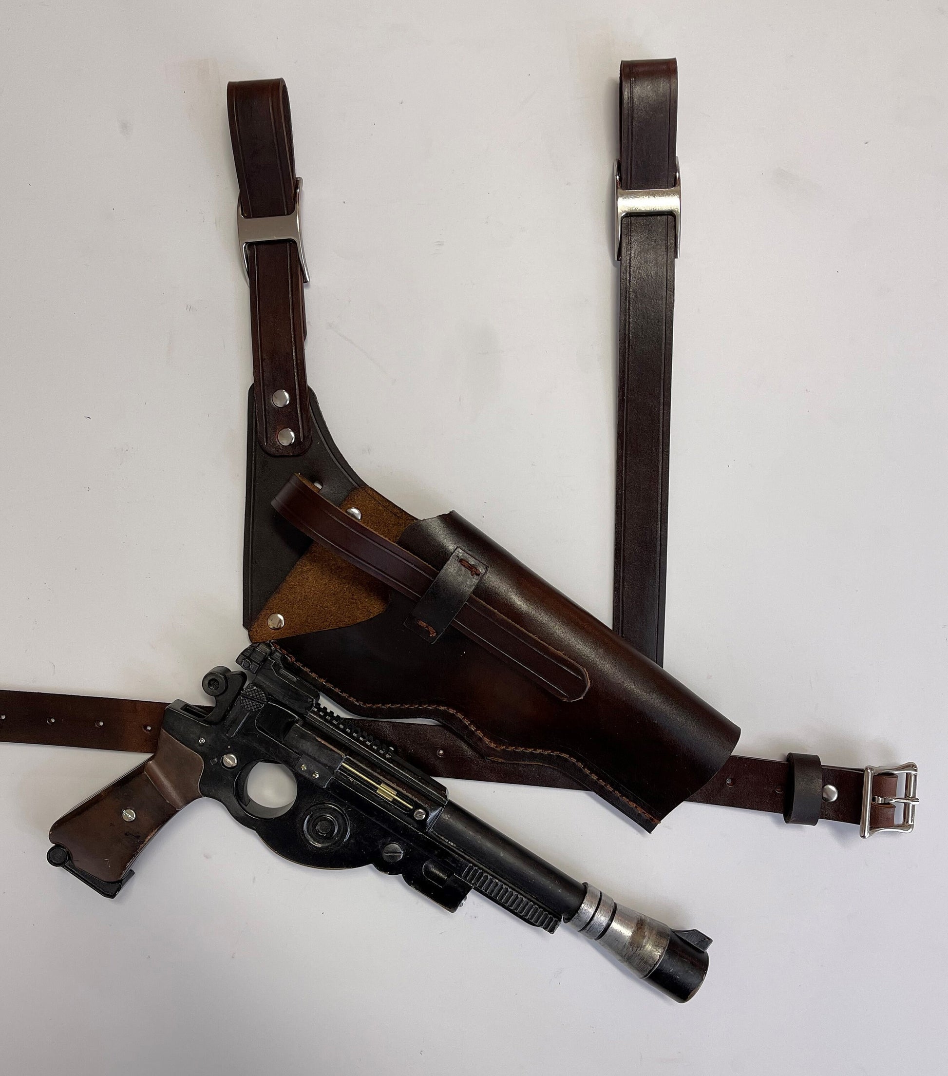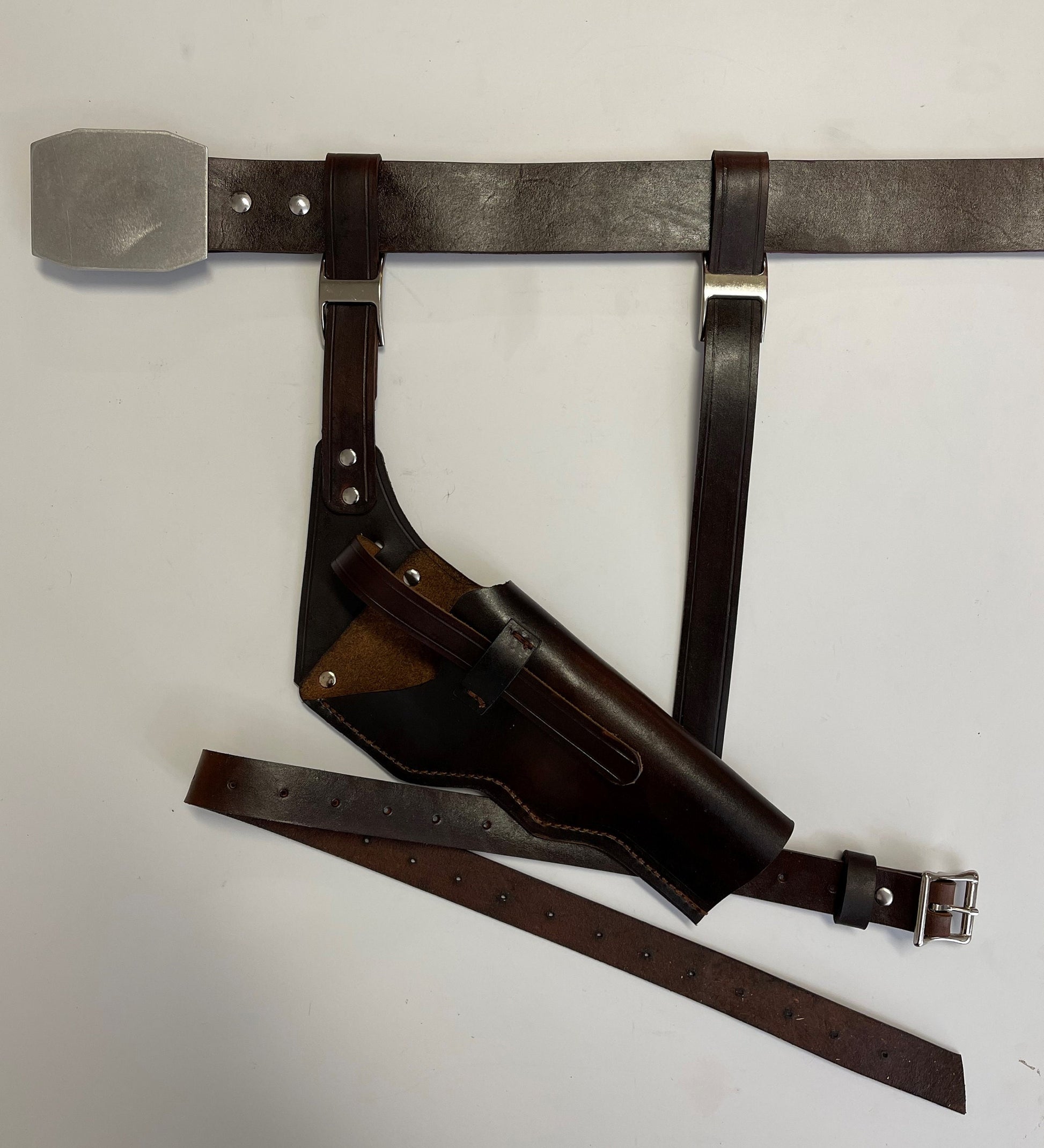 This is a real leather Holster inspired by The Mandalorian Disney+ show. The holster is made to fit an accurately scaled Hero Blaster. This version of the holster comes in a cross draw Gun Slinger configuration. Holsters can be bought individually or as a set with a matching belt and buckle.